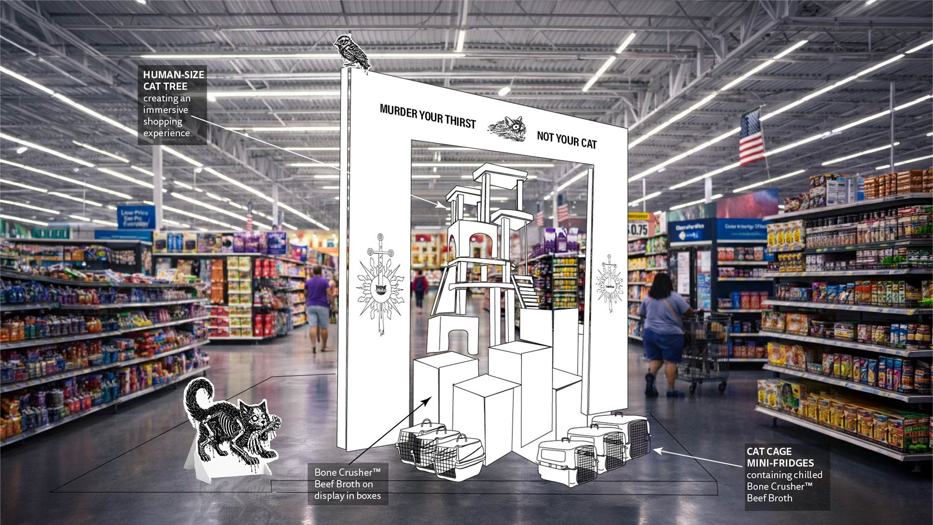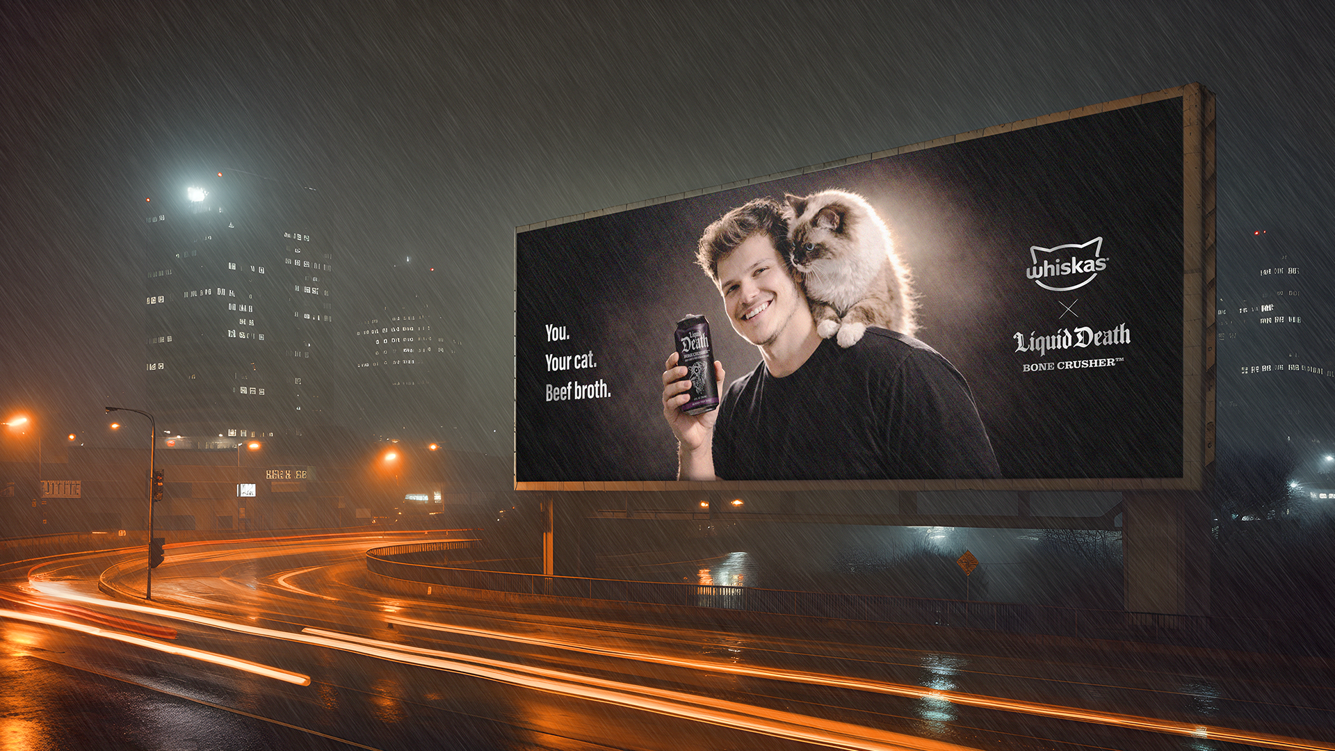 Whiskas is partnering with Liquid Death, a brand known for radical honesty, to create Bone Crusherâ„¢ Beef Broth. A brutally honest drink made from Whiskas ingredients that both cats and humans can share.